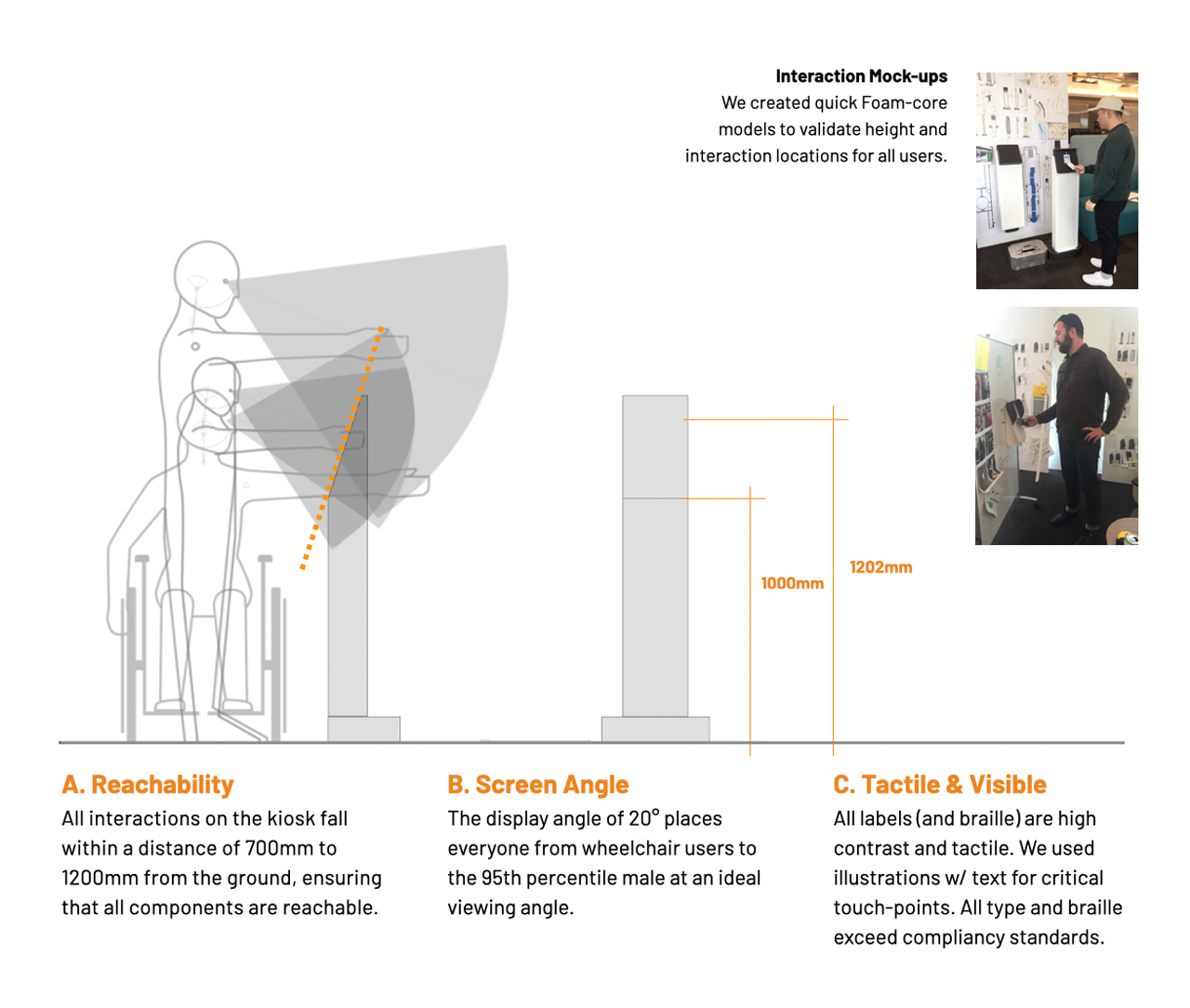 We started ideating with volume studies guided by ADA and AODA accessibility guidelines, informing size and proportions. Our decision-making prioritized accessibility ease and clear communication.